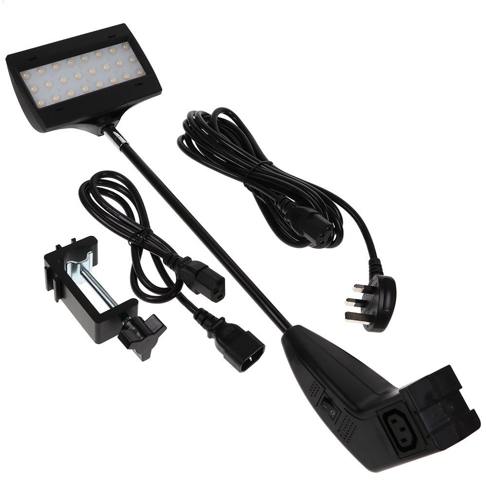 Features: Articulated head joint, clamp fitting, white LEDs, UK 3-pin plug, interconnecting cable, IEC 3 pin daisy-chain sockets